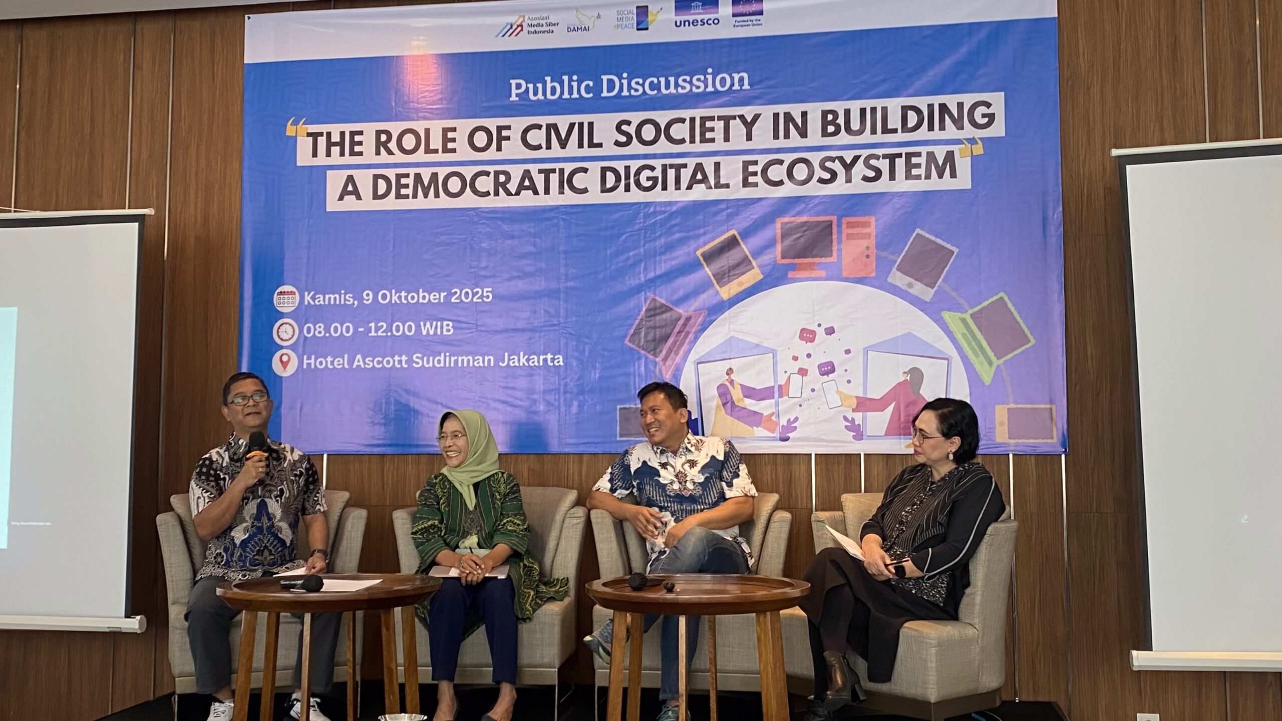Jakarta – Asosiasi Media Siber Indonesia (AMSI) pada 9 Oktober 2025 menyelenggarakan diskusi publik bertajuk “The Role of Civil Society in Building a Democratic Digital Ecosystem” bekerja sama dengan Koalisi Damai, dengan dukungan UNESCO dan Uni Eropa dalam proyek Social Media 4 Peace di Hotel Ascott Sudirman, Jakarta Selatan.